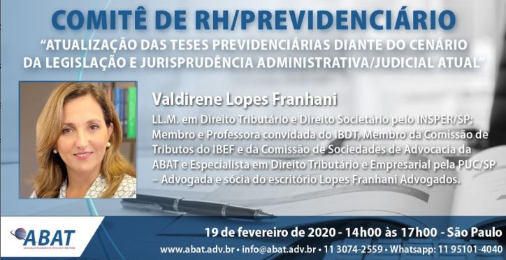 Convidamos nossos clientes e amigos a participarem, no próximo dia 19/02, de evento promovido pela Associação Brasileira de Advocacia Tributária – ABAT, que terá como objeto de discussão “Atualização das Teses Previdenciárias diante do cenário da Legislação e Jurisprudência Administrativa/Judicial Atual” e que contará com a participação de nossa sócia Valdirene Lopes Franhani. www.abat.com.br https://www.instagram.com/p/B8rnRLUJprT