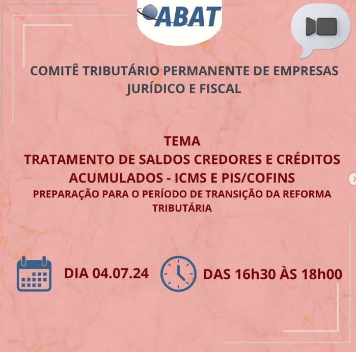 Na próxima quinta-feira (04/07/2024), das 16h30 às 18h, nossa Sócia e Presidente do Comitê Tributário Permanente de Empresas -Jurídico e Fiscal da ABAT, Valdirene Lopes Franhani, participará da reunião deste Comitê, acerca do tema – “Tratamento de saldos credores e créditos acumulados- ICMS e PIS/COFINS – preparação para o período de transição da Reforma Tributária”. O evento contará com a participação de executivas de grandes empresas e grupos empresariais e de consultoria tributária, sendo as convidadas: Liliane Goya (Schaeffler), Sueli Bersot (Reckitt) e Mariana C. Barreto (PWC). O evento será on-line. Participe! #lopesfranhaniadvogados #contencioso #abat #comitedeempresas #contenciosotributario #direitotributario #reformatributaria