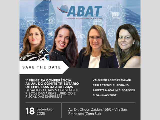 No próximo dia 18 de setembro, será realizada a 1ª Conferência anual do Comitê Tributário de Empresas, promovida pela ABAT. O encontro terá como tema os “Desafios atuais na gestão de riscos das áreas jurídico e fiscal das empresas “ com os seguintes painéis:• Gestão de Riscos Jurídico e Fiscal em Multinacionais: entre a insegurança e a estratégia;• Medidas de Ajuste Fiscal e Reforma da Tributação da Renda: como se preparar para o novo cenário;• Entre Teses e Incertezas: Leading Cases e previsibilidade nas decisões empresariais;• Reforma do Consumo: riscos, oportunidades e caminhos de implementação.O evento contará com a presença de nossa sócia, Valdirene Lopes Franhani, e profissionais de grandes escritórios e empresas (Waelzholz Group, Braskem, Ebanx, Cosan, JBS, Petrobras, entre outras). Será uma importante oportunidade de atualização e troca de experiências entre os profissionais do setor. Confira a programação completa:https://conferenciaempresas.abatadv.com.br #direitotributario#reformatributaria#tributacaoderenda#gestaofiscal #riscojuridico#eventoempresarial#tributacao#juridicocorporativo #compliance#leadingcases#ABAT2025#lopesfranhaniadvogados